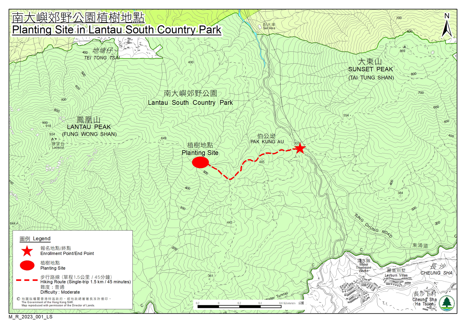 Start the hike at Pak Kung Au, walk uphill for about 45 minutes to reach the site at Lantau Peak at an altitude of about 500m. The hike offers beautiful scenery of Mong Tung Wan and Cheung Sha as well as the view of Tung Chung Town. After tree planting, participants are suggested following the same route back to Pak Kung Au.