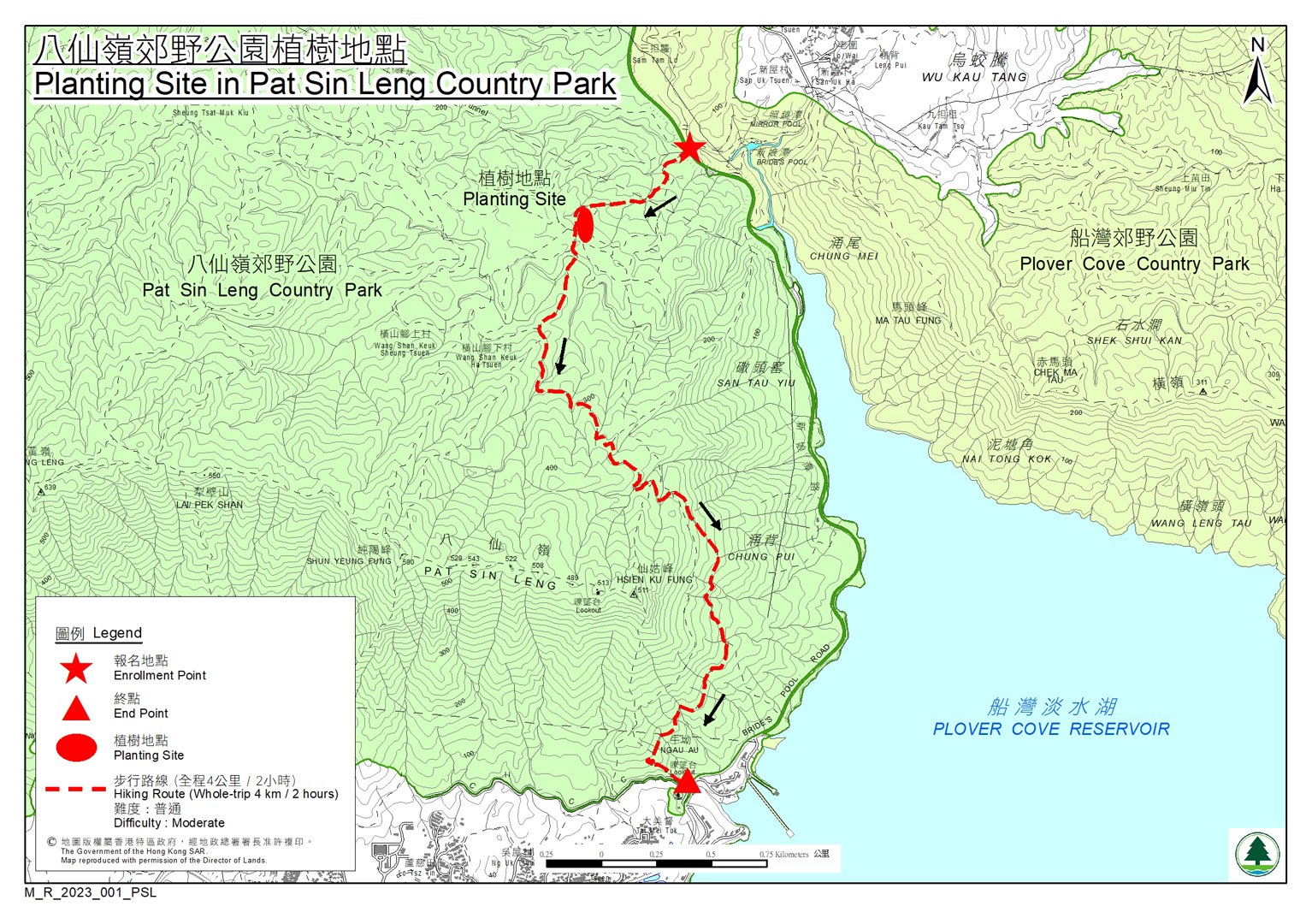 Start from Bride's Pool, walk uphill for 25 minutes to reach the site. After tree planting, participants may continue the route from the site to Tai Mei Tuk, which will take about 2 hours. Hikers can enjoy beautiful scenery of Wu Kau Tang and Plover Cove Reservoir can be viewed along the trail. Please note hikers would encounter rugged slopes in some sections.