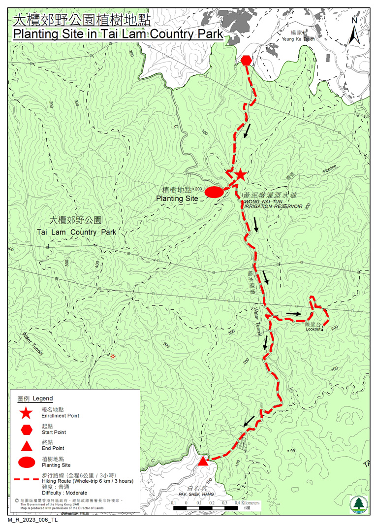 Start from Yeung Ka Tsuen, Yuen Long and walk uphill for about 50 minutes to reach the planting site. Along the way, participants can enjoy the beautiful scenery of Wong Nai Tun Irrigation Reservoir. After tree planting, participants can hike along the MacLehose Trail Section 10 to the Tai Lam Reservoir Islands viewpoint and overlook the panoramic view of Thousand-island Lake. |
