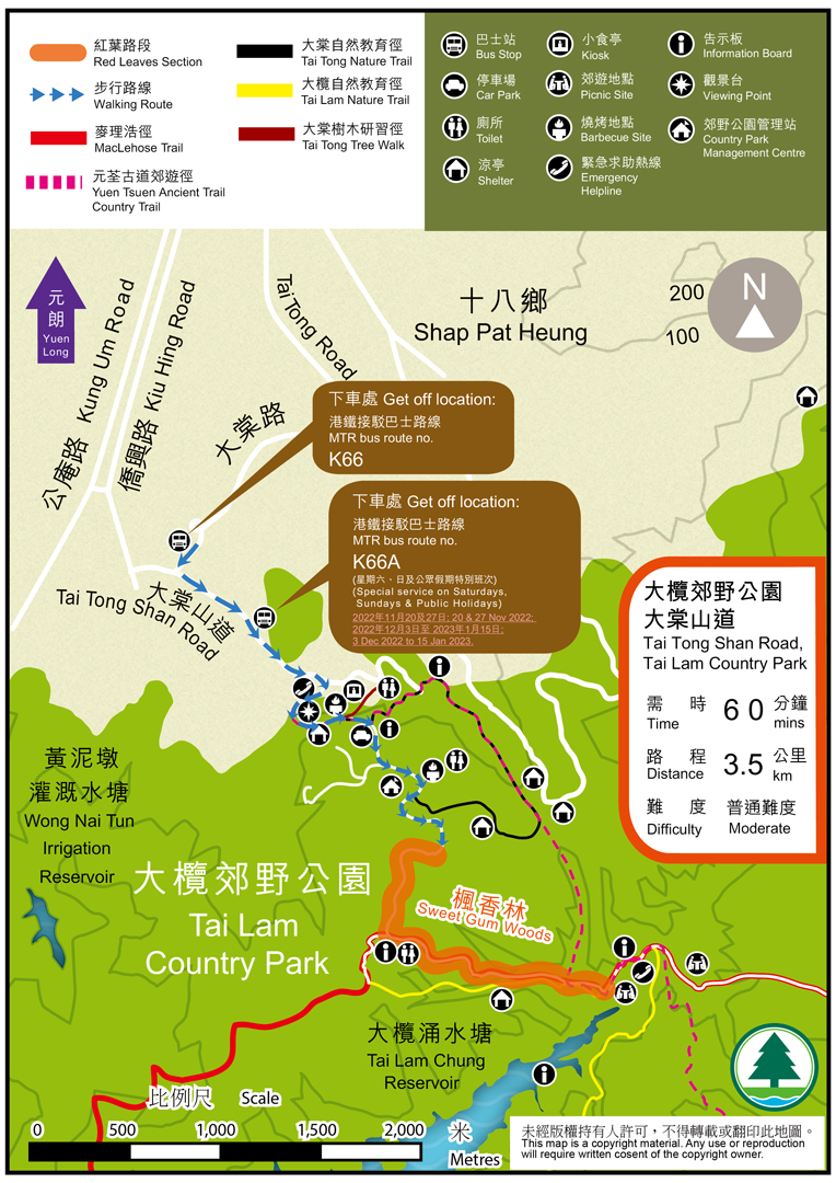 MTR will operate a special service on Route K66A on 20.11.2022 and 27.11.2022, and on Saturdays, Sundays and Public Holidays between 3.12.2022 and 15.1.2023, from Long Ping Station to Tai Tong Shan Road (MTR Hotline: 2881 8888).